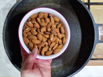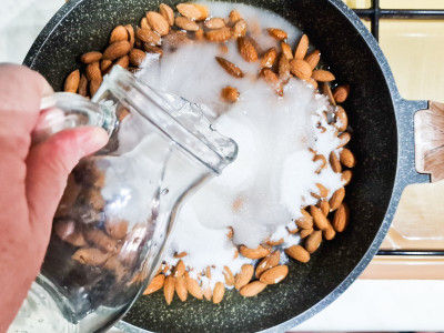 Metti le mandorle sgusciate all’interno di una padella capiente e unisci lo zucchero.
