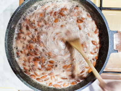 Ora che lo sciroppo ha iniziato a bollire, termina la cottura senza mai smettere di mescolare, fino a quando il liquido non si addensa diventando sabbioso e di un bel colore ambrato.