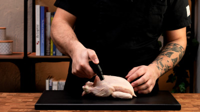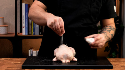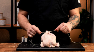 È opzionale, ma è utile legare il pollo per tenere la forma: con un nodo ferma uno spago ad una zampa, quindi lega le due zampe insieme. Con i due capi dello spago, gira intorno alle cosce, e passa sotto il pollo incrociando. Ora passando da sotto gira intorno alle ali, passa sotto e incrocia di nuovo e torna sopra alle cosce. Chiudi con un nodo e taglia l'eccesso.