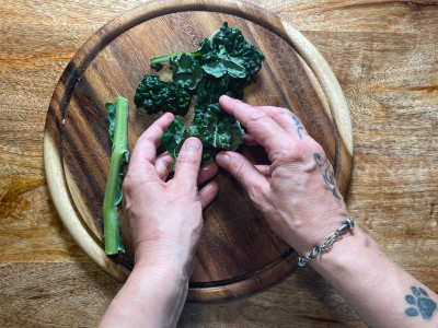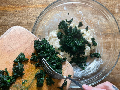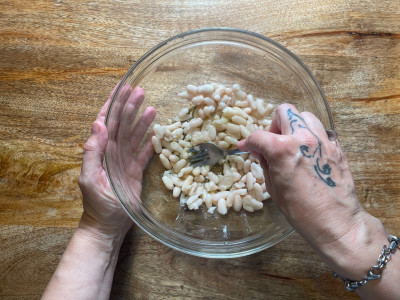 In una terrina versa i fagioli cannellini lessati e scolati. Aggiungi sale pepe, un giro d'olio e schiacciali con una forchetta. Non è necessario ridurli completamente in purea, si possono lasciare dei pezzi di legumi per dare una consistenza migliore ai burger. Elimina l'aglio dal cavolo nero e tritalo grossolanamente.