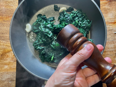 Aggiungi sale e pepe e insaporisci il cavolo nero, a fiamma dolce, per una decina di minuti, facendo evaporare l'acqua di vegetazione.