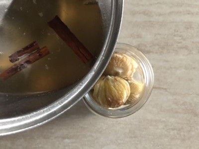 Sistema le castagne mondate in un vasetto che le possa contenere tutte, cerca di metterle strette tra di loro in modo da riempire più spazio possibile. Versa nel vasetto, sopra alle castagne, lo sciroppo bollente, fai scivolare nel barattolo anche le stecche di cannella.