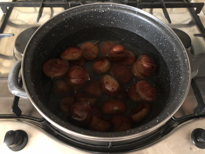 Aggiungi l'acqua nel tegame, fino a ricoprire tutte le castagne, se ti piace metti anche un po' di sale, ma non è obbligatorio. Accendi il fuoco sotto al tegame delle castagne e porta ad ebollizione, dal primo bollore conta 40 minuti, trascorso il tempo di cottura, spegni il fuoco e scola le castagne. Facendo attenzione a non scottarti, con l'aiuto di un coltellino, sbuccia le castagne, togliendo anche la pellicina che si trova tra la buccia e la polpa.