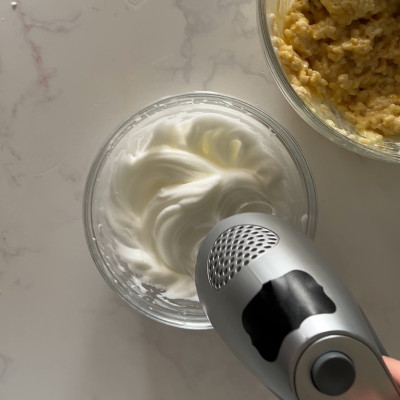 In una ciotola a parte, monta gli albumi a neve ferma, con l'aiuto delle fruste elettriche. Infine, usando una spatola con movimenti dal basso verso l'alto, aggiungi gli albumi precedentemente montati.
