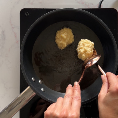 Scalda l'olio in una padella, preleva, aiutandovi con due cucchiai, un po' di composto e fallo scivolare nell'olio caldo. Fai friggere le frittelle di riso da ambo i lati a fuoco medio, rigirandole appena saranno dorate.