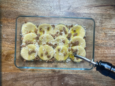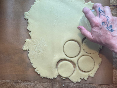 Aiutandoti con un coppapasta o con un bicchiere ricava dei dischi. Impasta di nuovo i ritagli rimasti e stendili, procedi con la formazione di altri gnocchi. Disponi gli gnocchi di semolino in una pirofila, in cui hai versato un filo d’olio, leggermente sovrapposti. Grattugia il sostituto vegano del grana sulla superficie e arricchisci con i cubetti vegani gusto pancetta