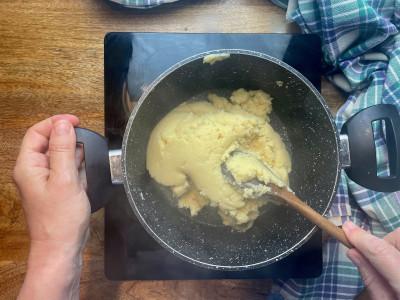 A fiamma bassa cuoci, sempre mescolando con un cucchiaio di legno, fino a quando il composto non si staccherà dalle pareti della casseruola. A questo punto togli la pentola dal fuoco e unisci il sostituto vegano del parmigiano per insaporire. Stendi poi il composto su un foglio di carta forno aiutandoti con il mattarello. Devi lasciarlo spesso circa 1 cm.