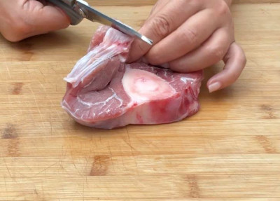Per preparare gli ossibuchi alla milanese per prima cosa metti le fette di carne su un tagliere in legno e con un coltello ben affilato fai delle incisioni sulla membrana esterna, in questo modo non si arricceranno in cottura. Passa gli ossibuchi così preparati nella farina che avrai preparato in una ciotola a parte.
