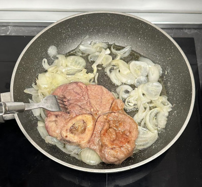 Metti gli ossibuchi nella padella con le cipolle stufate e sfuma con il vino bianco e il brodo di carne. Metti un cucchiaio di passata di pomodoro, mescola e copri con un coperchio lasciando un piccolo sfiato. Lascia cuocere la carne a calore basso per circa 1 ora.