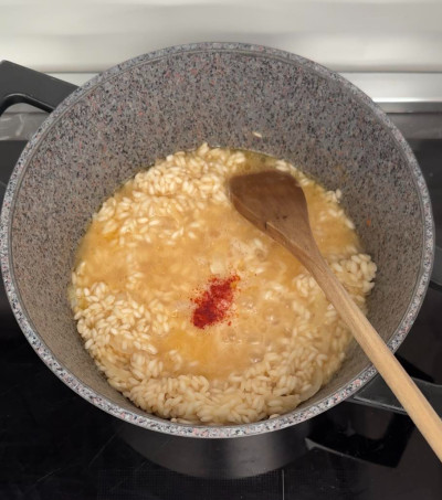 Aggiungi lo zafferano e mescola. A fine cottura togli il risotto allo zafferano dal fuoco e manteca con altro burro e parmigiano.
