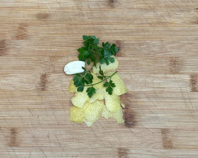 Trita insieme l'aglio sbucciato, le zeste di limone e il prezzemolo.