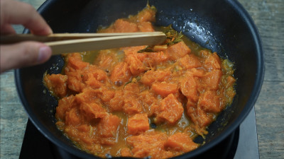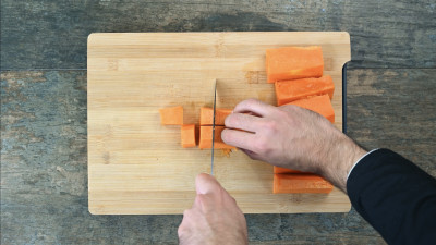 Nel frattempo taglia la zucca a dadini e uniscila allo scalogno in padella. Aggiungi un rametto di rosmarino, aggiusta di sale e cuoci spadellando, se sei pratico o semplicemente mescolando con un cucchiaio di legno. Continua la cottura della zucca aggiungendo del brodo vegetale.