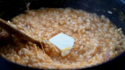 Una volta cotto manteca il risotto con una bella noce di burro e del parmigiano. Servi il risotto con lo speck croccante e una macinata di pepe nero.