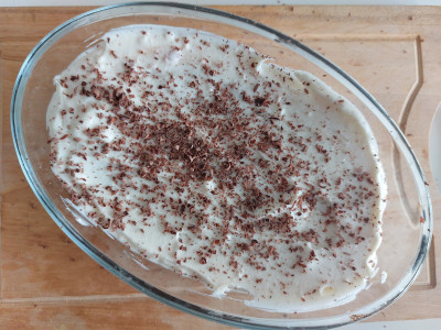 Spolverizza l'ultimo strato di crema con abbondante cioccolato fondente grattugiato, puoi grattugiarlo con un mixer o con una grattugia a fori larghi. Metti in frigo il tiramisù senza uova e mascarpone per almeno 2 ore prima di servire.