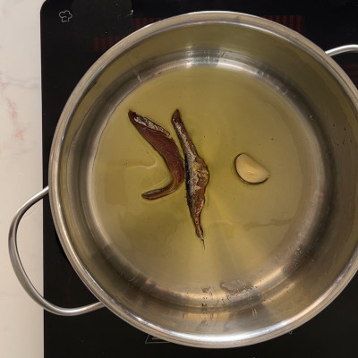 Nel frattempo che i ceci si cuociono nella loro acqua, sbuccia lo spicchio di aglio, lava il peperoncino e il rosmarino e dilisca le acciughe. Tamponale con un foglio di carta assorbente da cucina. In un tegame dal fondo spesso, versa l'olio e aggiungi l'aglio, il peperoncino, il rosmarino e le acciughe. Fai rosolare tutto a fiamma moderata, schiacciando le acciughe fino a farle sciogliere.
