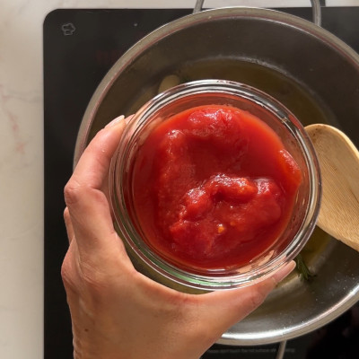Quando le acciughe saranno quasi sciolte, bagna il fondo con il vino bianco e fai evaporare la parte alcolica, ci vorranno un paio di minuti. Successivamente aggiungi i pomodori pelati e schiacciali con un cucchiaio, aggiusta di sale, copri e fai cuocere per 10 minuti.
