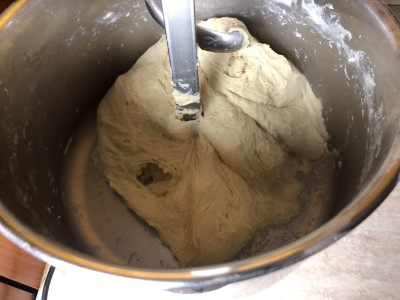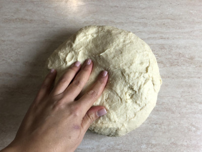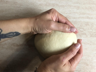 Quando l'impasto è pronto, ribaltalo sul piano da lavoro, fai qualche piega veloce, copri con una ciotola a campana e fallo riposare per 30 minuti circa.