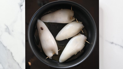Farcisci i calamari con il ripieno e chiudili con uno stuzzicadenti.