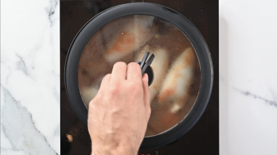 Rosola i calamari ripieni in un tegame con un filo d'olio. Sfuma con il vino bianco, aggiungi la salsa di pomodoro, un mestolo d'acqua calda e il prezzemolo tritato.