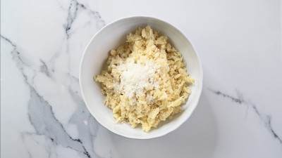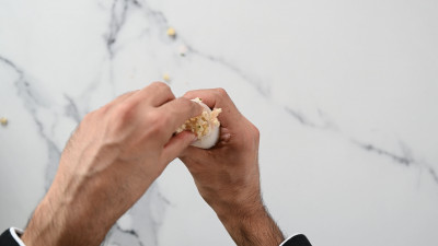 Aggiungi la mollica di pane, il pecorino, il prezzemolo, l'aglio tritato, i capperi, i pinoli, l'uvetta, sale, pepe e pasta d'acciughe con olio e amalgamiamo il tutto. Se la mollica dovesse risultare troppo asciutta, ti consigliamo di inumidirla con un po' di acqua per poter compattare bene gli ingredienti.