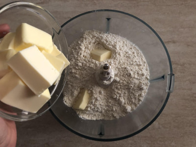 Ecco come preparare la casetta di pan pepato: versa la farina e il burro freddo a pezzetti nel robot da cucina, o in una planetaria, se non ne hai uno, puoi impastare a mano direttamente sul piano di lavoro leggermente infarinato.