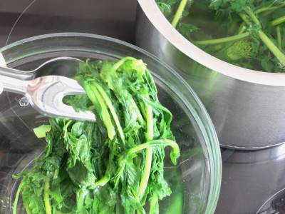 Per cucinare la pasta con cime di rapa e salsiccia, per prima cosa pulisci le cime di rapa togliendo le parti più dure e filamentose, togli le foglie gialle e le parti deteriorate, lava le cime di rapa selezionate sotto il getto dell'acqua corrente e, infine, sbollentale in abbondante acqua salata.