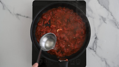 Bagna il sugo con un mestolo dell'acqua di cottura della pasta. Quando la pasta sarà al dente scolala nella padella, insieme al cavolfiore.