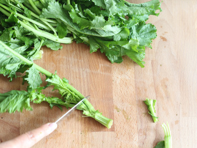 Per preparare un buon pesto di cime di rapa, inizia dall'accurata pulizia della verdura.