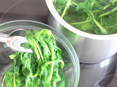 Preleva le cime di rapa e trasferiscile in una ciotola con acqua molto fredda, questa operazione serve per fermare la cottura e mantenere il colore verde brillante.
