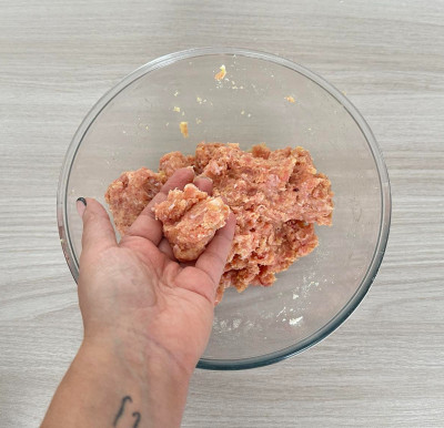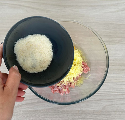 Aggiusta di sale, aggiungi il parmigiano reggiano grattugiato e impasta un po' con la mano, unisci anche il pangrattato e continua ad impastare con la mano nella ciotola.