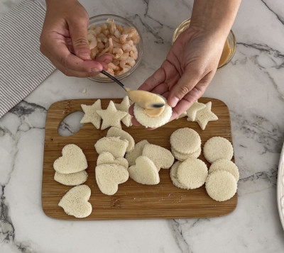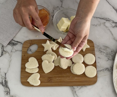 Ecco come preparare le tartine miste con i tuoi ingredienti preferiti: metti una fetta di pan carrè su un tagliere e, con delle formine per biscotti, ricavane tante tartine, cercando di ottimizzare lo spazio per non creare troppo avanzo di pane. Le forme degli stampini possono essere a tuo piacimento, anche se per le feste sono molto carini stelle e cuori.
