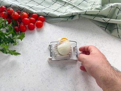Prepara 3 uova sode, sgusciale e tagliale a fettine con un taglia uovo o con un coltellino. Mettine da parte 4 o 5 fette scelte dal centro dell'uovo, serviranno per la guarnizione finale. Con una forchetta riduci il resto delle uova a pezzettini, condisci con sale, pepe e un filo di olio extravergine di oliva.
