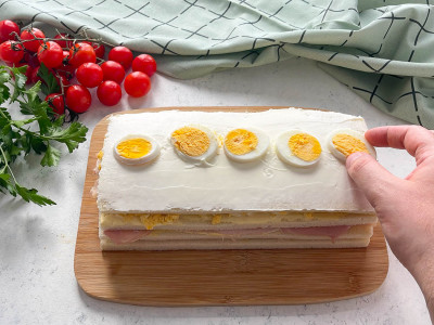 Al centro della fetta disponi su una riga le fettine di uovo sodo, su ognuna di esse metti un cappero e una fogliolina di prezzemolo. Ai lati della superficie disponi i pomodorini e le olive tagliati a metà. Puoi guarnire la torta tramezzino con gli ingredienti che ti piacciono o con quello che hai in dispensa.