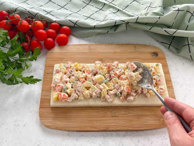 Su una fetta di pane per tramezzini metti l'insalata russa, cerca non lasciare spazi vuoti. Copri con un'altra fetta e spalma la maionese sulla parte superiore. Disponi le fette di prosciutto cotto sopra la maionese, in modo che coprano tutta la superficie.