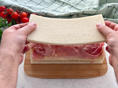 Copri con una fetta di pane per tramezzini, spalma la superficie con altra maionese e ricopri con le uova a pezzettini. Procedi con l’ultima fetta di pane per tramezzini e ricopri la superficie con del formaggio fresco spalmabile.