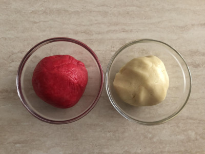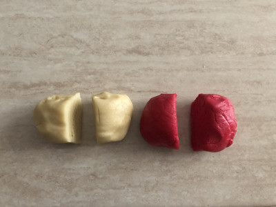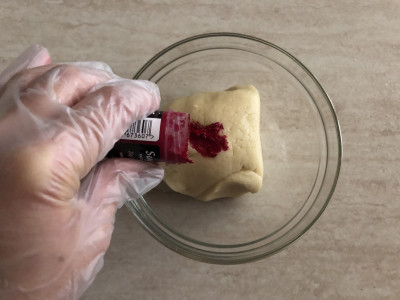 In una delle due parti aggiungi un pizzico di colorante rosso, amalgama il colorante all'impasto utilizzando dei guanti per non rischiare di macchiarti le mani.