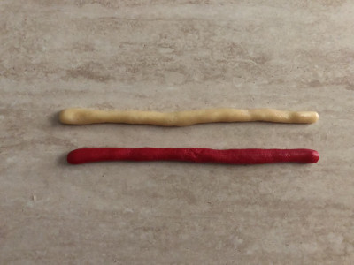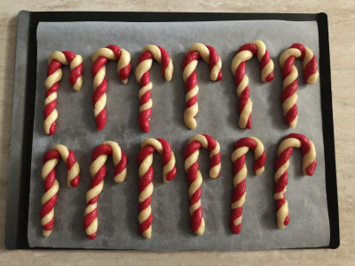 Prendi due palline di diverso colore, allungale e attorcigliale fra loro, infine curva la parte superiore dando la forma tipica a bastone curvo, infine sistema i biscotti su una teglia ricoperta da carta forno.