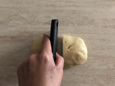 Ribalta l'impasto sul piano da lavoro, dividilo in due parti e sistema entrambi i pezzi in due ciotole.