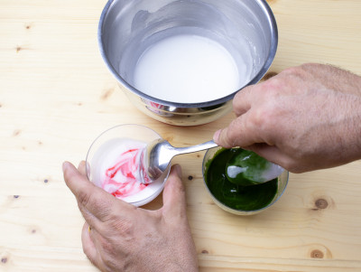 Nel frattempo che l'impasto si raffredda, prepara la glassa: versa in una ciotola l'acqua e lo zucchero, mescola con un cucchiaio, dividi la glassa ottenuta in tre ciotole, una lasciala bianca, nelle altre due metti una goccia di colorante, una verde e l'altra rossa. Trasferisci la glassa nelle apposite sac a poche e tieni da parte.