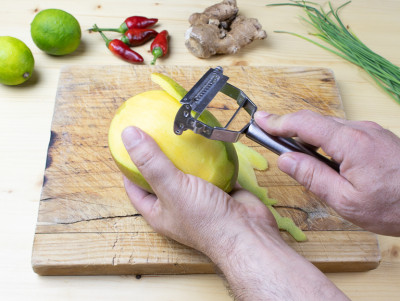 Lava e pela il mango, taglia la polpa grossolanamente e mettila in una ciotola. Con uno spelucchino sbuccia la radice di zenzero fresca e grattugialo abbondantemente sopra la polpa di mango.