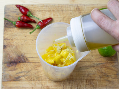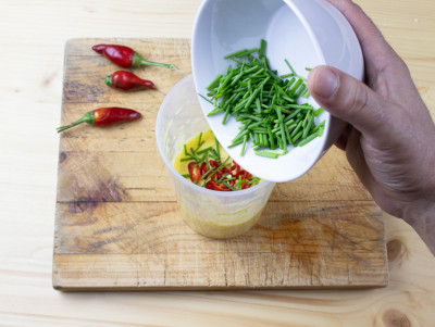 Adesso aggiungi alla frutta un bel filo di olio extravergine di oliva e frulla tutto con un mixer ad immersione. Su un tagliere, con un coltello, trita grossolanamente il peperoncino e l'erba cipollina.