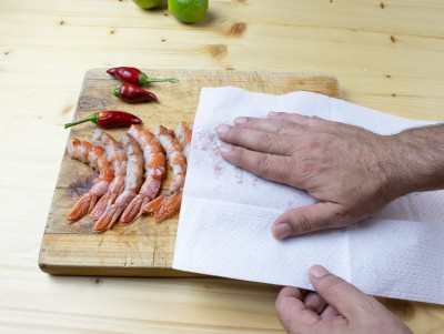 Dopo averli sciacquati in acqua corrente fredda, scola i gamberi e togli loro il carapace, successivamente rimuovi anche il filo dell'intestino, per questa operazione aiutati con la punta di un coltellino.