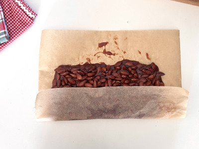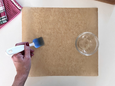 Spennella un foglio di carta forno con un filo d'olio di semi e versa il torrone al suo interno.